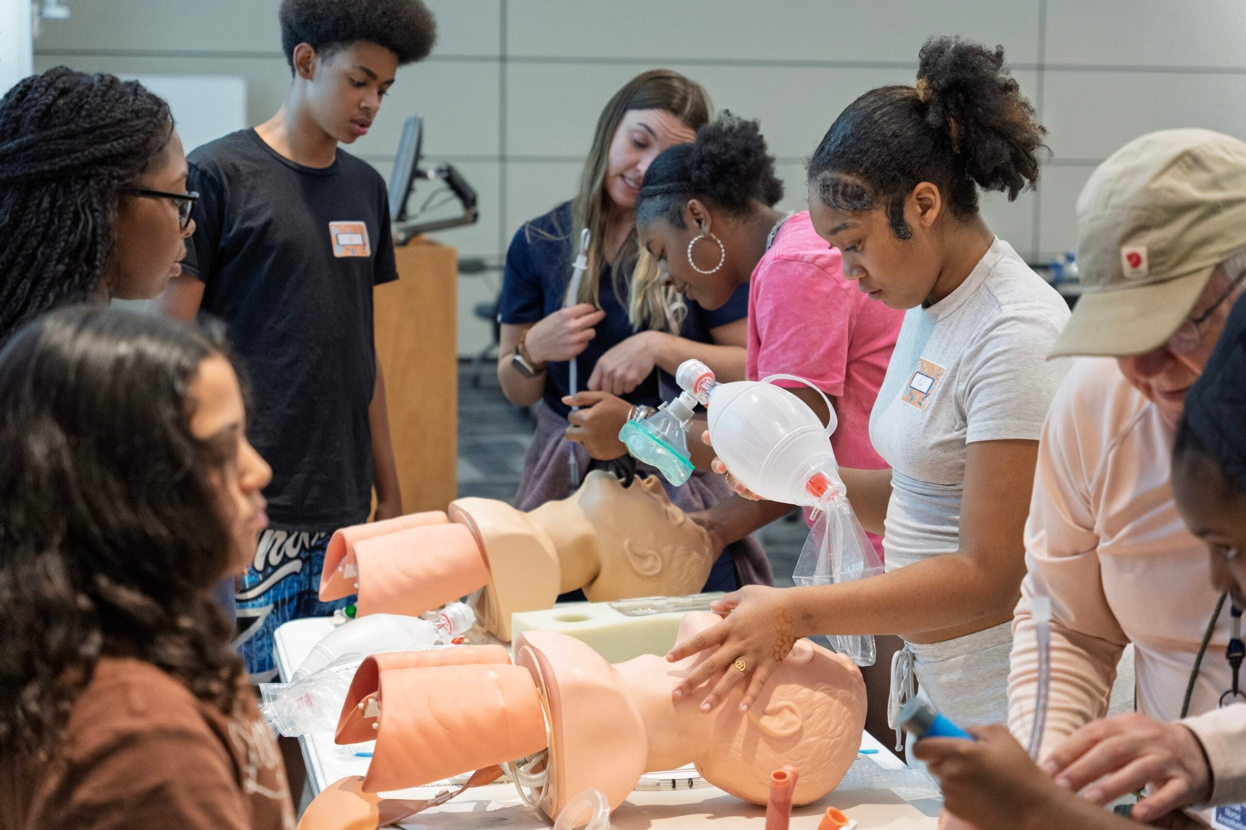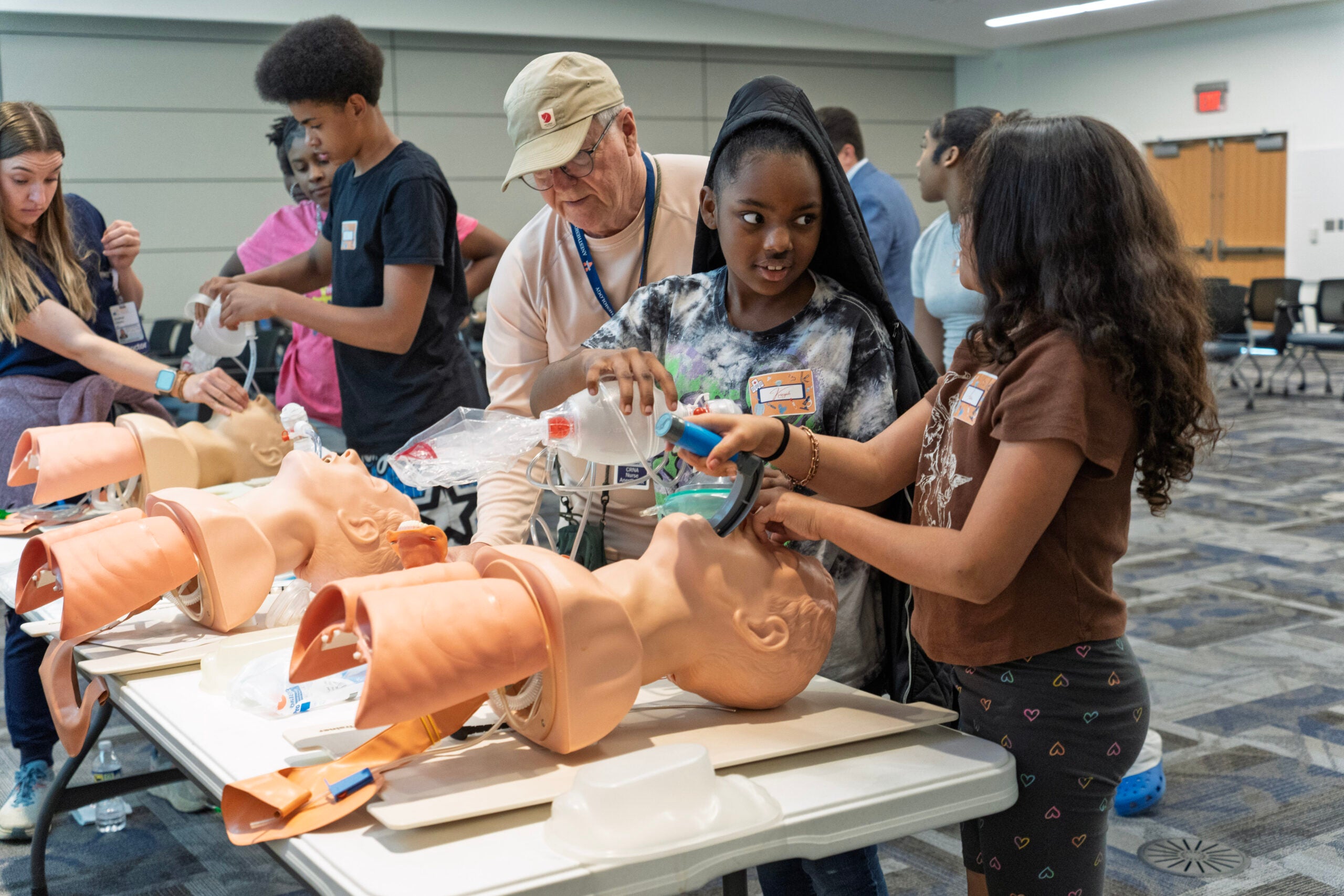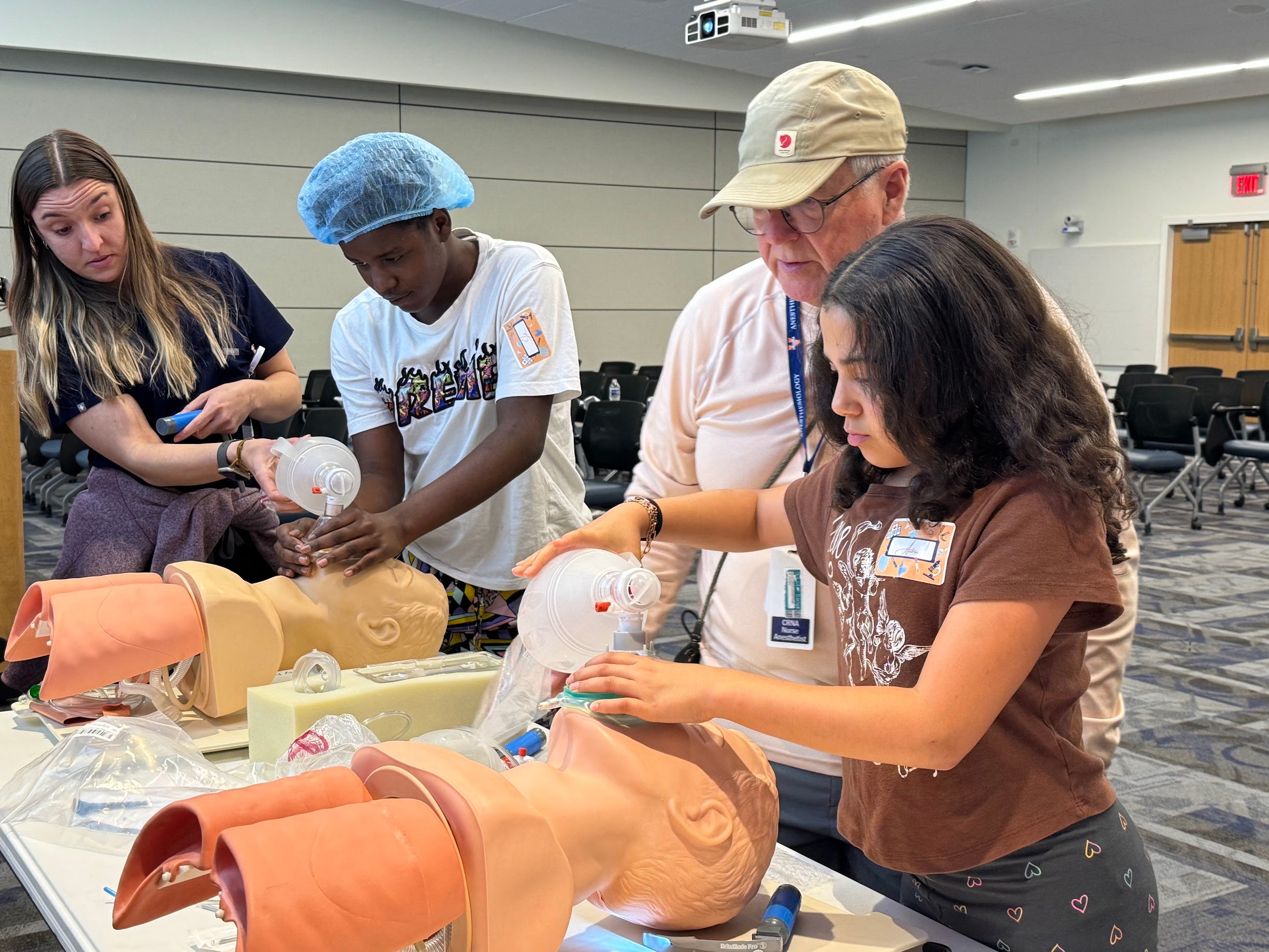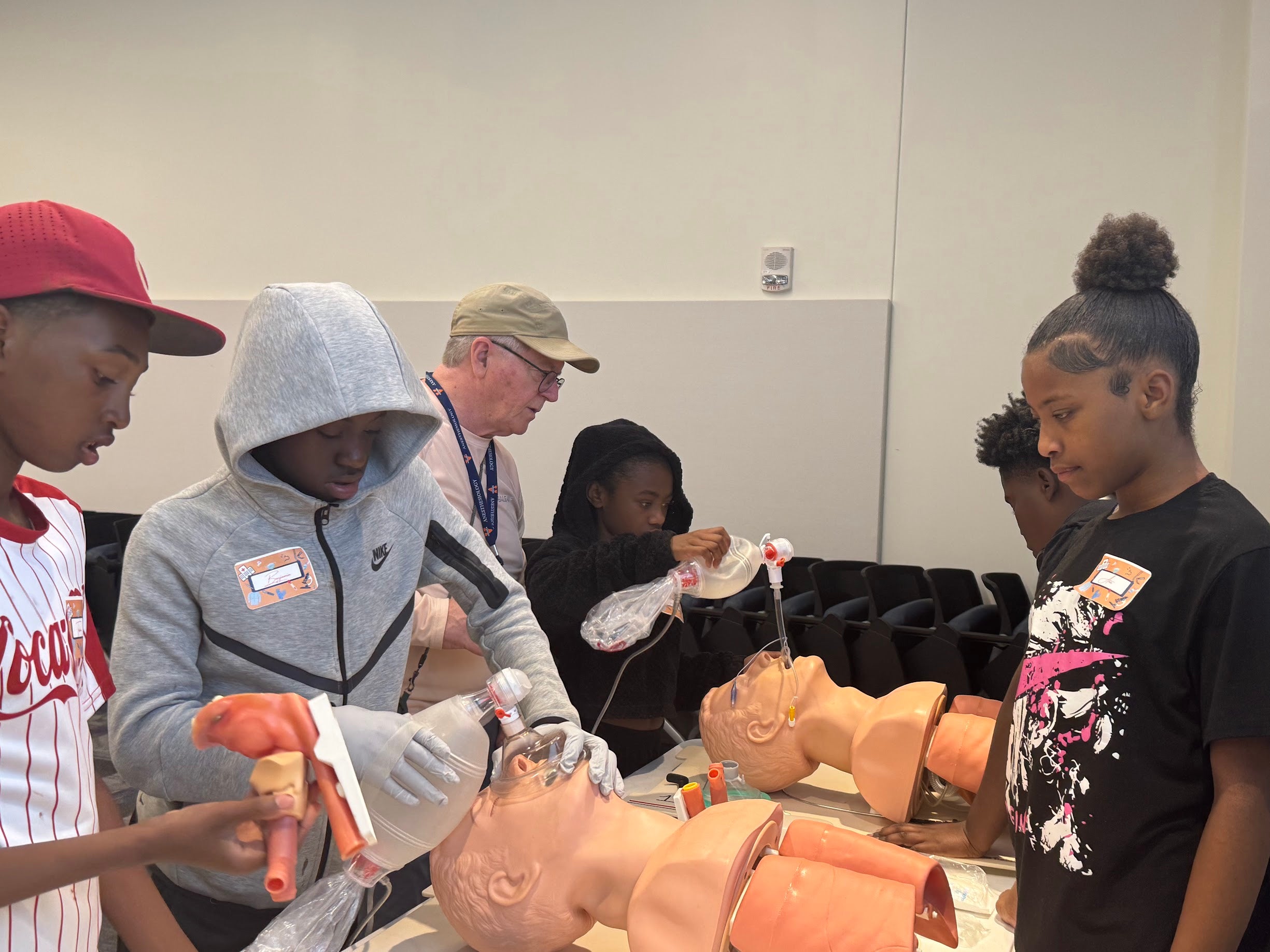Led by Dr. Josh Roach, and Khaing Nwe Phoo from Anesthesiology, along with HCDI community outreach leaders – Drs. Ansley Scott and Nouran Sinada, the event invited youth to explore medical equipment, practice basic clinical skills, and engage directly with healthcare professionals. From simulating anesthesia procedures to discussing college pathways, the program was developed to demystify the medical field and inspire future healthcare leaders.