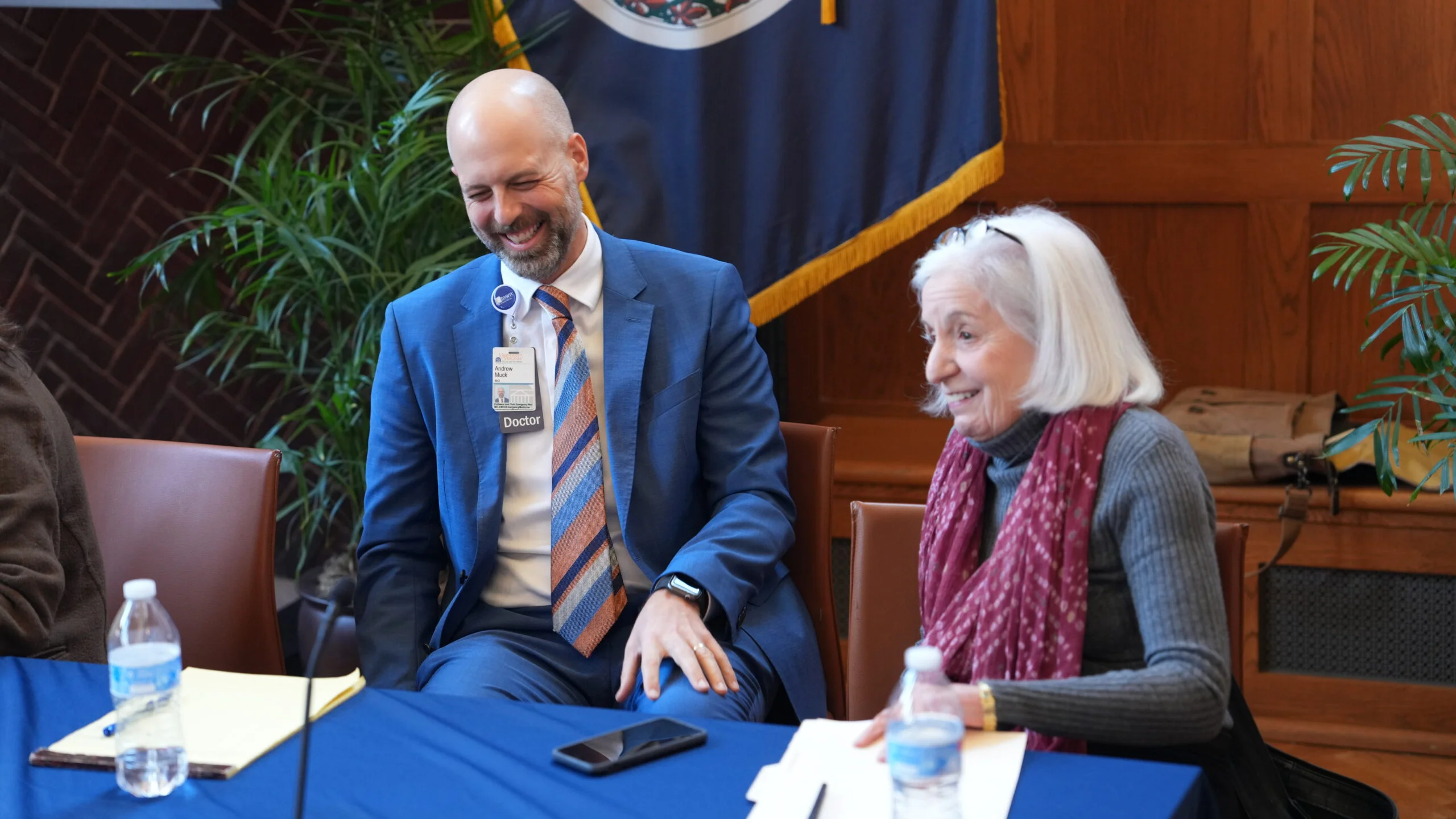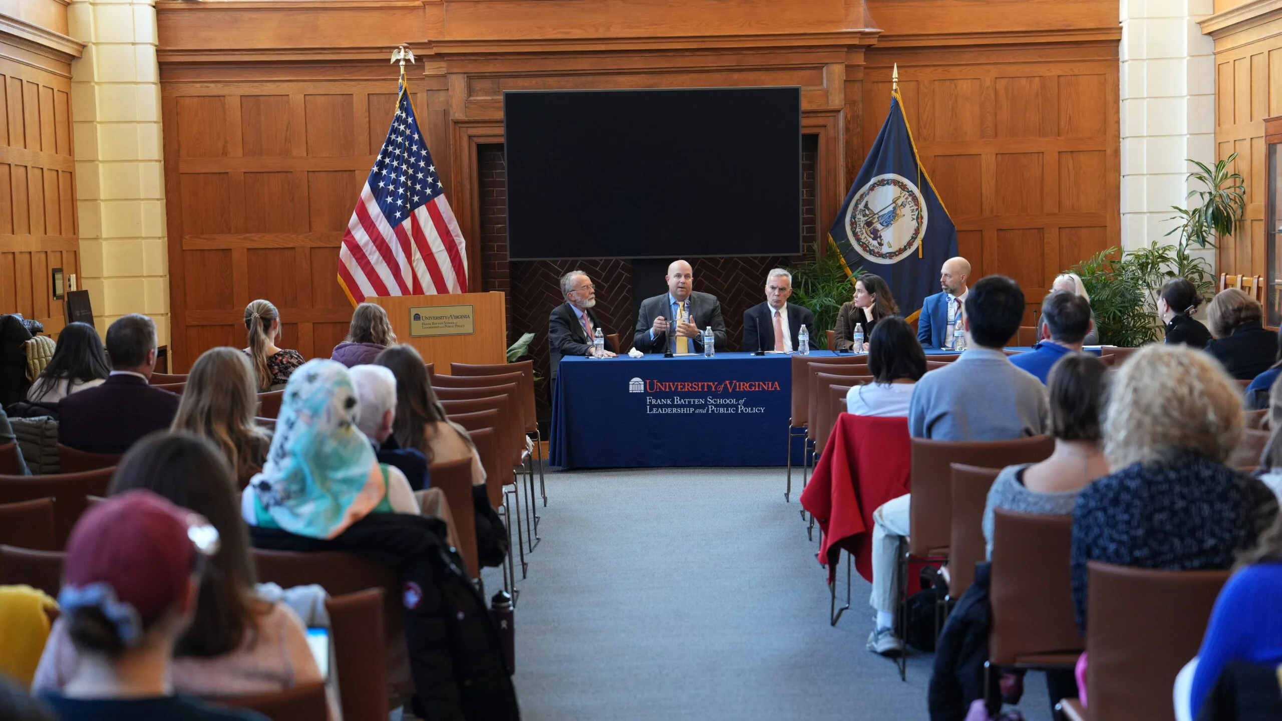 The School of Medicine hosted an open forum about perspectives on providing medical support in conflict zones on November 29 at Garrett Hall. The event, attended by faculty, staff, and students, was moderated by Professor Kirsten Gelsdorf in the Batten School of Leadership and Public Policy. She welcomed panelists from the School of Medicine: Leigh Grossman, MD, Professor, Department of Pediatrics; Andrew Muck, MD, Professor and Chair, Department of Emergency Medicine; Greg Saathoff, MD, Professor, Departments of Public Health Sciences and Emergency Medicine; and Mark Weathers, MBA, School of Medicine Chief of Staff, as well as Andy Thomson, MD, Assistant Director, UVA Center for the Study of the Mind and Human Interaction.